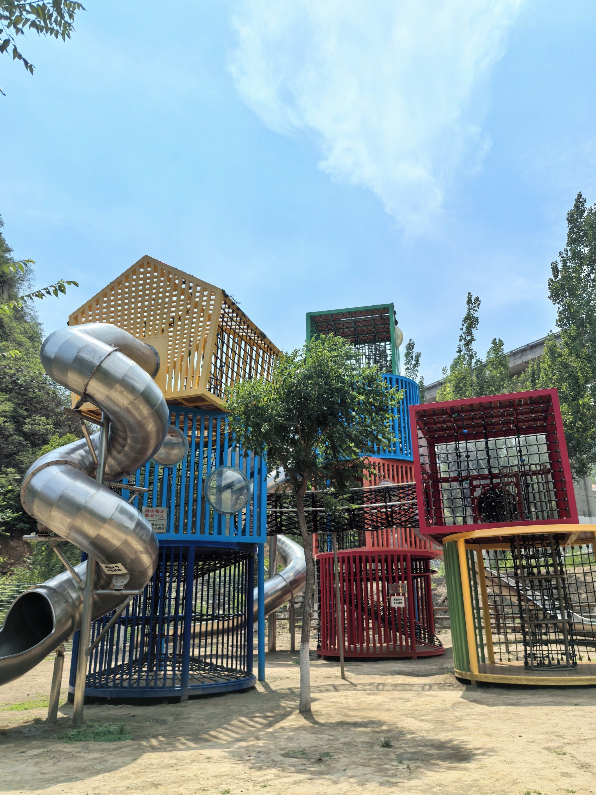松果主题滑梯群:结合树屋造型,设置螺旋滑道、波浪滑道等趣味形态,模拟丛林穿梭体验;